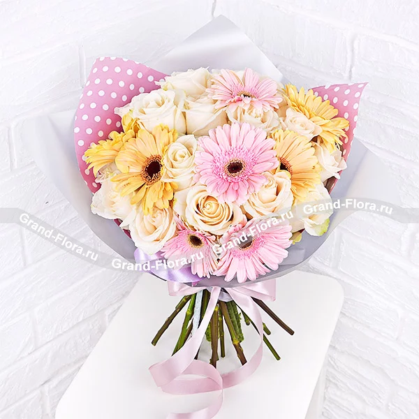 роза белая - 15 шт., гербера розовая/оранжевая - 4 шт., гербера желтая/кремовая - 4 шт., упаковка, лента. Примерный размер: 40Х40 см.